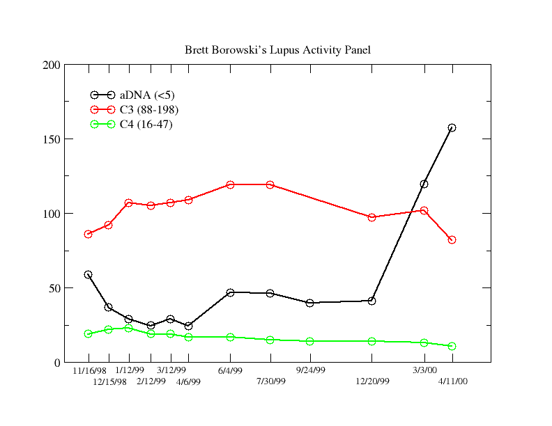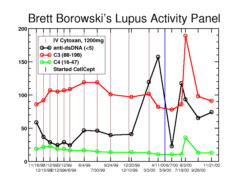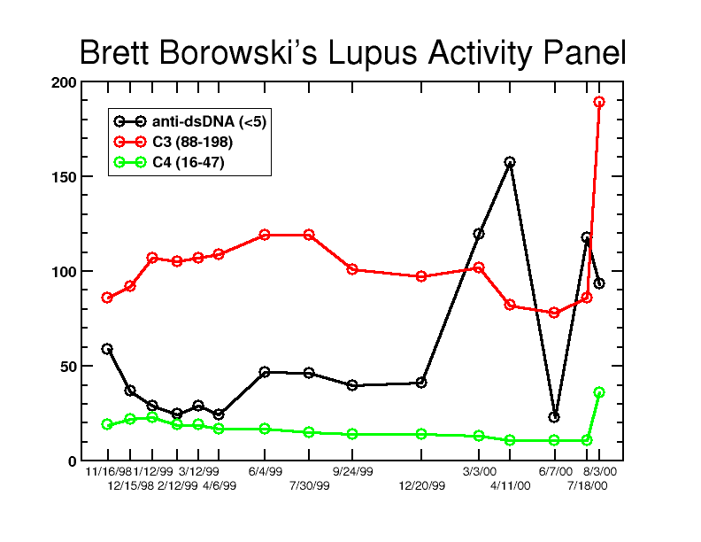 It was very boring year Healthwise, anyway. And that's just the way I like it. 2002A little more "interesting"February 6, 2002 I saw Dr. Kepecs last week and he called to tell me about the latest lab results. The news wasn't so good. My 11/26/01 aDNA was 46.6 and my C3 and C4 complement levels were 85 (actually normal!) and 13 respectively. But my levels on 1/28/02 were 374.4 for aDNA and 54 and 5 for the respective C3 and C4 complement levels. And though I haven't felt really good since my post-Christmas cold, I wouldn't describe myself as sick. People have commented at work that it looks like I've lost a little weight, too. As silly as it may sound, this mild weight loss that people notice may be a significant predictor of my health. It seems that when these labs change significantly for the worse, it often (about 75% of the time) predicts a flare 8-10 weeks off Many doctors don't follow these labs as often and with the consistency necessary for this to be very helpful, and there's also the old mantra, "treat the patient, not the labs." But given my history (and a few other, minor signs of increased disease activity), Dr. Kepecs wants to be aggressive and pulse me with steroids. He conferred with Dr. Williams and she agreed with that plan. There's no question that there's increased serologic activity. And having missed 3 months of work in 1998 (Drs. Kepecs and Williams took over in the midst of the catastrophe of 1998 and fixed me up), I'm not a big fan of "wait-and-see." There are other options to pulse steroids, but they're not particularly attractive: