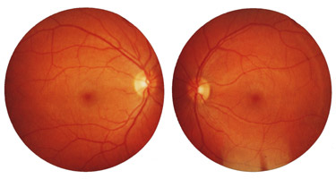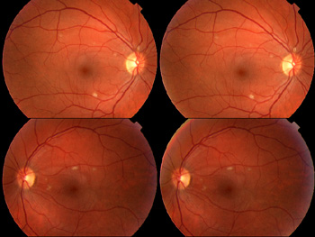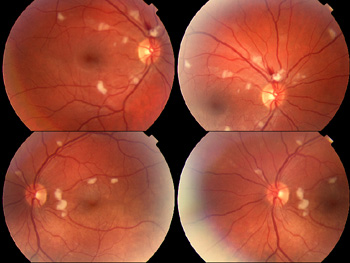 For a few weeks now, I've been noticing problems with my vision. The photos on right show what Dr. Thromberg (O.D.) saw when she examined me. She explained that since this was a medical issue. I really needed to see Dr. Lui, an M.D. a week or so later. He felt this was clearly lupus retinopathy. As for treatment, we were already doing more for the systemic lupus than he would have done for the retinopathy alone.